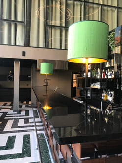In the grandly proportioned lobby, open shelving and assorted seating styles help create smaller zones within the huge space, and geometric patterns break up the expanse of marble floor. Particularly eye-catching is the green, frond-covered central lamp, hanging from the ceiling like some kind of prehistoric bird's nest as well as the grand sculptures.